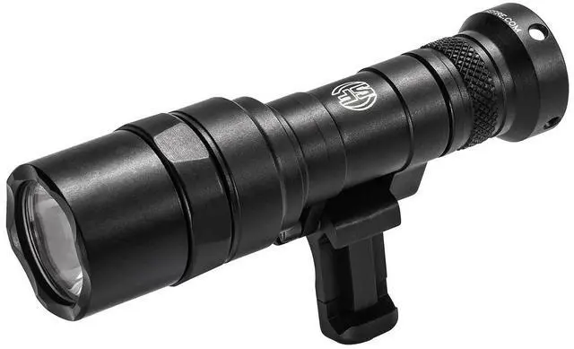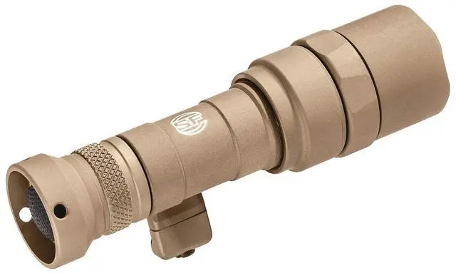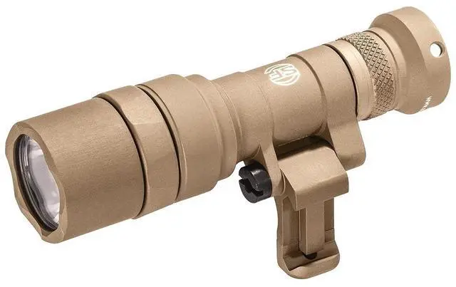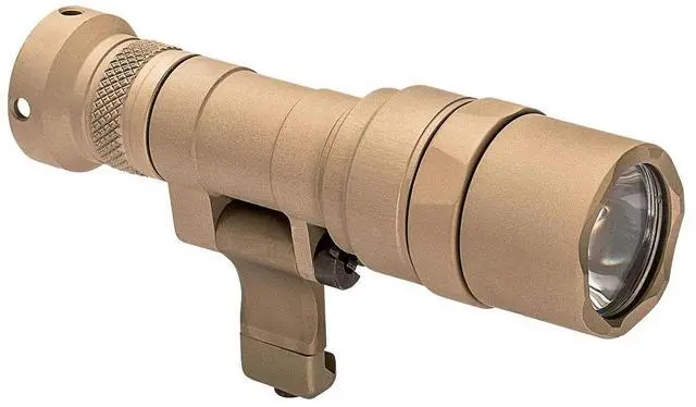 The tan SureFire Mini Scout Light Pro Weaponlight can be mounted on a Picatinny or M-LOK rail and swivels as neededtoward the rifle to reduce snagging on brush or away from it to make room for other gear. Lightweight at 4.1 ounces and compact at 4.1 inches, the Mini Scout Light Pro delivers 500 lumens through a Total Internal Reflection lens for a bright beam with long throw and ample surrounding light. The light is controlled on a momentary or constant-on basis with a push-button tailcap switch, shrouded to guard against accidental activation. Its hard-anodized aluminum housing is O-ring sealed against the elements.