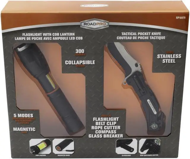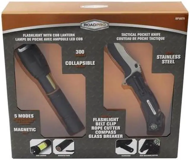 RoadPro Flashlight & Knife 2 Piece ComboBrand NewThe RoadPro RP18079 is two piece combo includes a lantern flashlight and tactical pocket knife that are perfect for on-the-go needs.