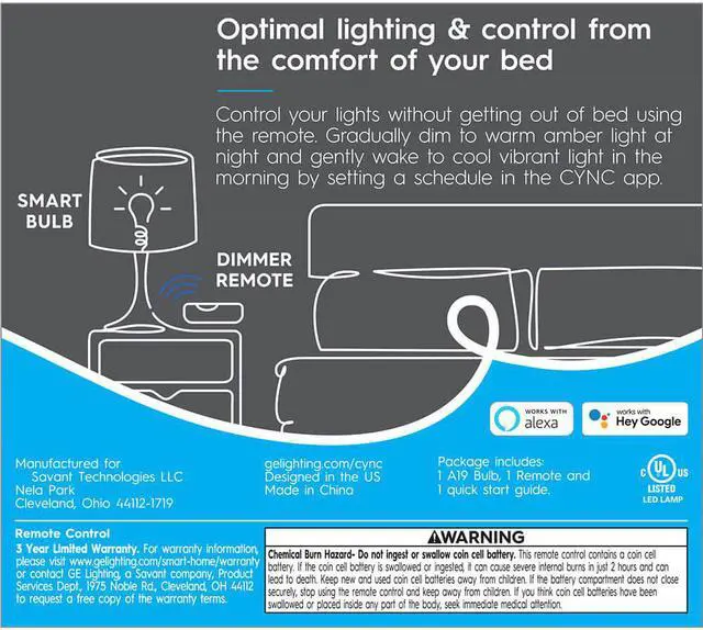 Use Your Voice To Turn On Lights Directly connect to your Google Assistant or Amazon Alexa for voice control of your lights. Control Smart Lights Away From Home Get lighting control away from home through the Cync app - no hub or bridge needed. Schedule Your Lights Around Your Daily Routine Create schedules that turn your lights on when you are away from home and turn your lights off when you go to bed. Set Scenes For Every Occasion Set scenes like dimmed light for movie time or bright lights when you get home. No Hub Required Control the Tunable White Bulb and Wire-Free Remote using the Cync app with no additional hub or bridge required.