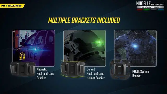 The NU06 LE is a mini LED safety and signal light specifically designed for outdoor activities and law enforcement personnel. It comes with four LEDs in a compact X formation: white, blue, green and red. Each LED can be activated on a constant-on, a flashing mode, and a setting allows for red and blue LED flashing as a warning signal. The NU06 LE on its own is arc rail compatible yet still comes with 3 lightweight brackets: a flat magnetic bracket for metal surfaces, a curved bracket for hook-and-loop surfaces, and a four way MOLLE system bracket. Now the NU06 LE is capable of being attached to literally every surface, from tactical bags, helmets, hook-and-loop patches, MOLLE systems on vests and armour, and anywhere else you can think of.
