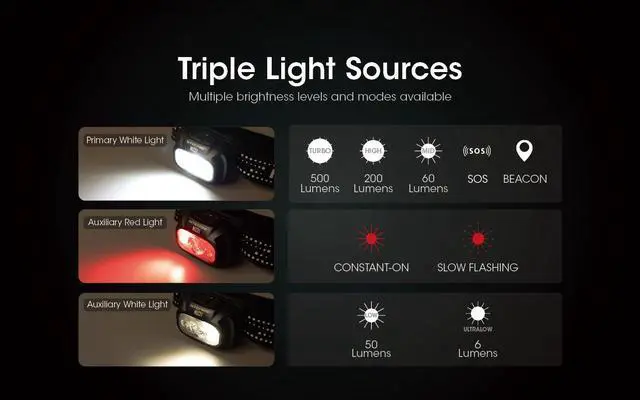 The Nitecore NU31 rechargeable headlamp is the perfect companion for any outdoor activity, whether it's a casual adventure or a thrilling escapade. Its unibody optical lens system ensures optimal performance by emitting a bright 550 lumen beam that can reach distances of up to 158 yards on Turbo mode. The NU31 offers versatility with its primary white LED that provides three brightness settings, as well as an emergency SOS and beacon. The high CRI auxiliary LED delivers smooth flood illumination, making it ideal for close-up tasks and reading. Alternatively, switch to the red auxiliary LED to protect your night vision or for a long-lasting signal light.
