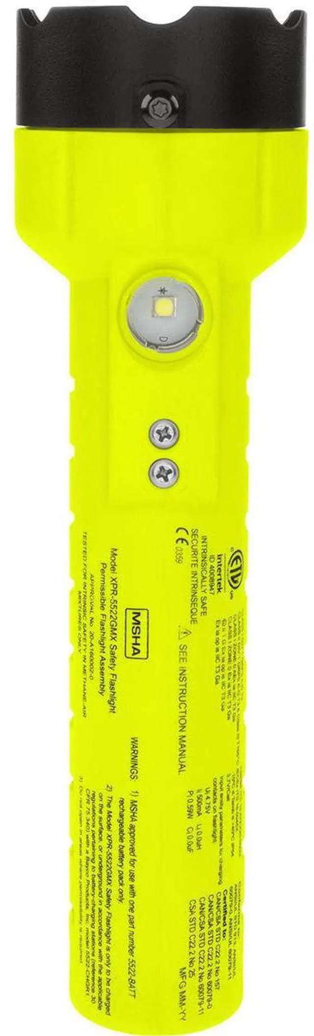 While the XPR-5522GMX Intrinsically Safe Rechargeable Dual-Light Flashlight with Dual Magnets is a robust and reliable lighting solution, its advanced features set it apart from the competition. Certified by cETLus, ATEX, IECEx, and MSHA, this flashlight is intrinsically safe and permissible for use in hazardous locations, both above and below ground, where explosive gases and dusts may be present. Equipped with a high-performance LED rated at a bright 240 lumens, this flashlight works in harmony with a high-efficiency deep parabolic reflector to generate a powerful, usable beam that can reach up to 178 meters.
