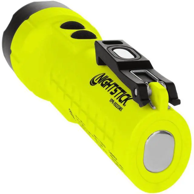 This makes it an ideal choice for those needing a reliable light source in challenging environments. Adding to its versatility, the XPR-5522GMX also incorporates a 175-lumen unfocused floodlight into its sturdy housing, providing optimal close-up illumination. For maximum flexibility, both the flashlight and the floodlight can be activated simultaneously, catering to a wide range of lighting needs. The flashlight's dual body switches offer momentary or constant-on functionality for the flashlight, and simple on/off functionality for the floodlight. To enhance its usability, integrated magnets are strategically located in the base of the handle and the pocket clip, enabling almost limitless hands-free usage.