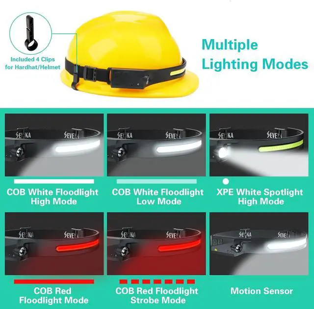 Modes & Lightweight: SEVENKA comfortable headband light only weighs 2.47 oz/70 g with built-in 1200 mAh lithium battery. You'll feel nothing even wearing it all day. Short press power button 5 times to cycle through COB high / COB low / Spot light high/ Spot light low mode/OFF. Long press power button while light is on it can turn as SOS strobe light for emergency situation. Adjustable headbands fit for adults or kids and it is provided to make your head get the best comfortable conditionIncluded Hardhat Clips & Durable Elastic Headband: With water resistant function LED headlamps are built to last and protected against heavy rain or snow. Whenever you wear headlamp outdoors you wouldn't need to worry if it rains unexpectedly. Suitable for camping riding running night walking mountaineering fishing hunting reading car repairing DIY works or emergency situation like fire hurricane storm power outage. Included headlamp clips for narrow-edged hardhat helmetAdjustable