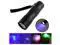 The flashlight emits a 395 nanometer wavelength light and is built with rugged, machined aluminum construction with a sleek design