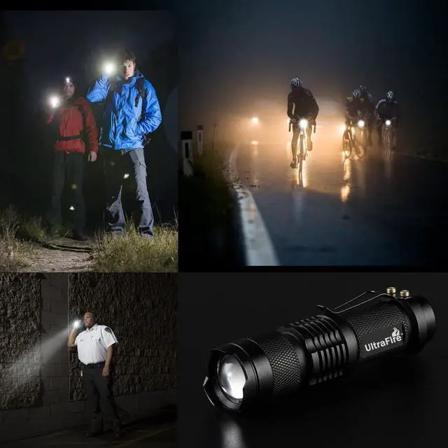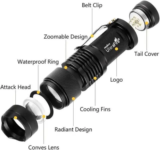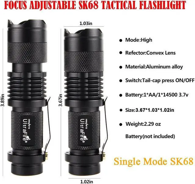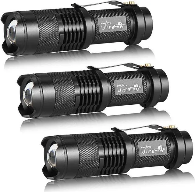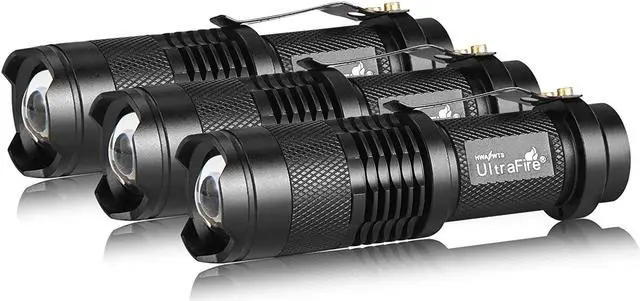 Single mode, 300 Lumens UltraFire SK68, Ultra Bright to light up an entire room. Pack of 3, you will get 1 mode mini flashlights, don't need to cycle the modes. Tough and reliable, IP6-rated water resistant and designed for use in heavy rain Its durable aluminum body and shock-resistance endure rough handling. Compact to fit easily into your pocket wherever you go, and has an anti-slip finish that holds fast in your hand. Features of zoomable.