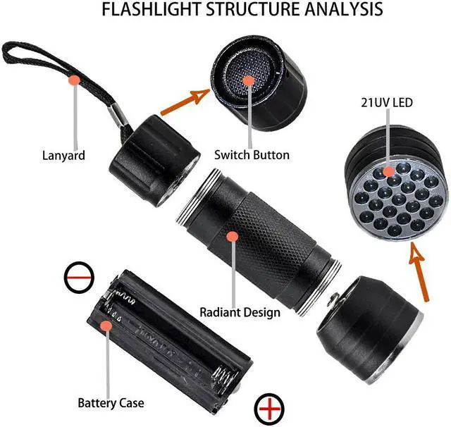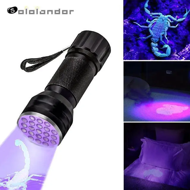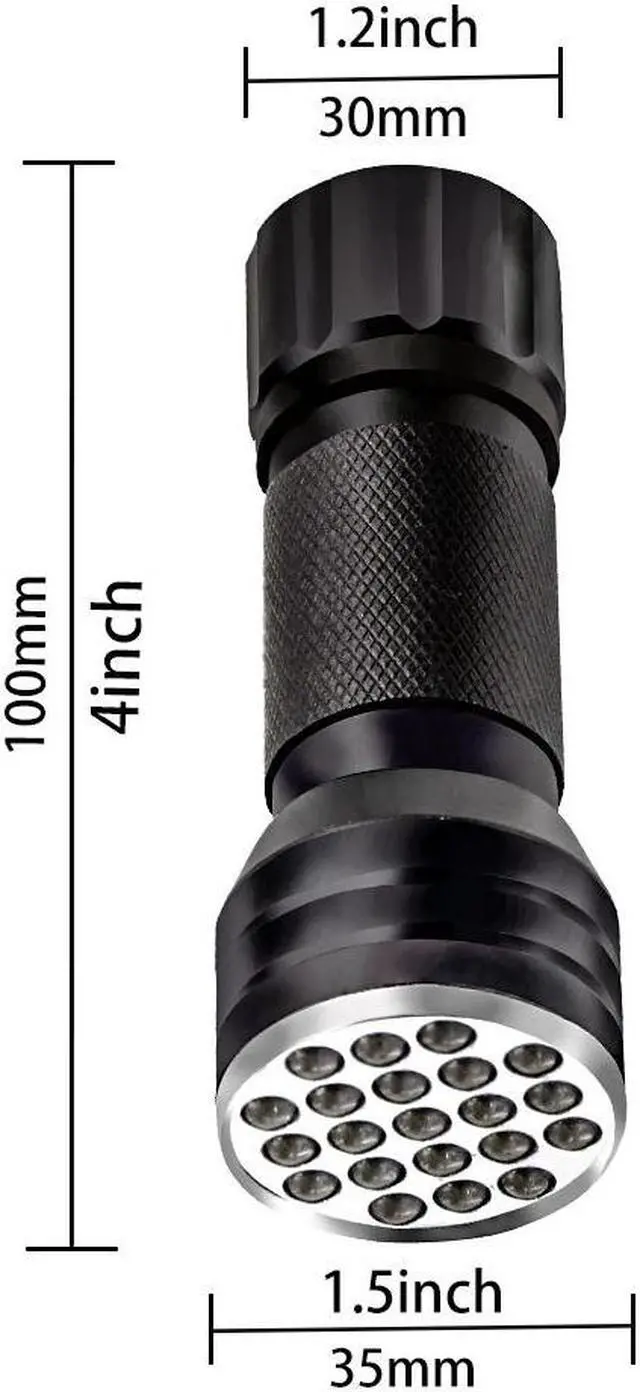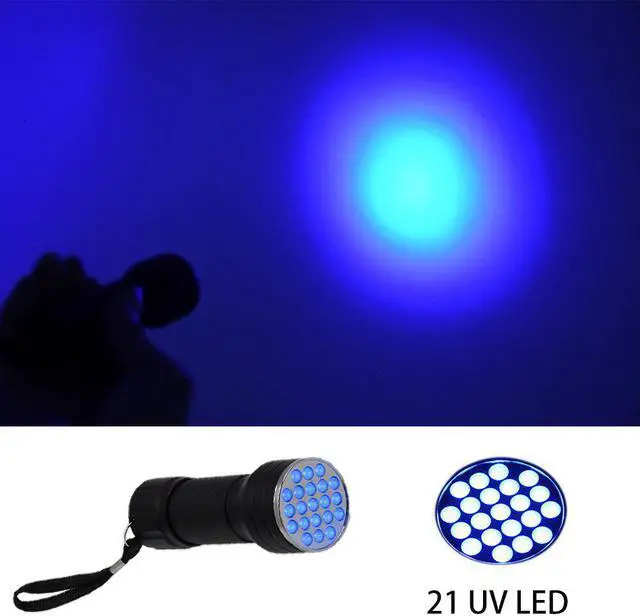 This uv flashlight with 21 UV LEDLED allows you to cover a much bigger area without losing the intensity of the UV light. The application is perfect for inspection applications, security control, rodent contamination, hotel room inspection, and much more. Emits 395 nanometer wavelength 21UV LED allow to cover a larger area Makes semen stains and other bodily fluids fluoresce. Perfect for outside use such as hunting scorpions and minerals. Water and shock resistant.Widely used in fluorescent anti-counterfeiting, fluorescence fiber special lighting industry