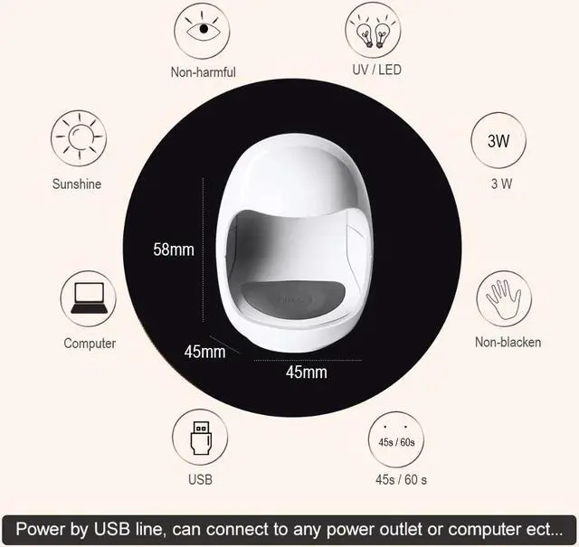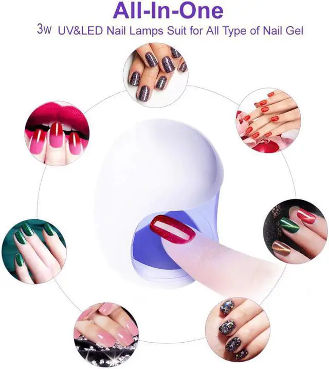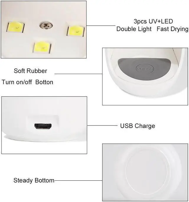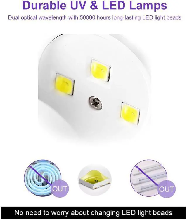 1.New technology of double light source covers a wider range of ultraviolet band, suitable for drying nail UV-glue, builder gule, nail polish gel, sculpture gel, gem glue and LED nail gel. No need to worry about distinguishing your nail gel.