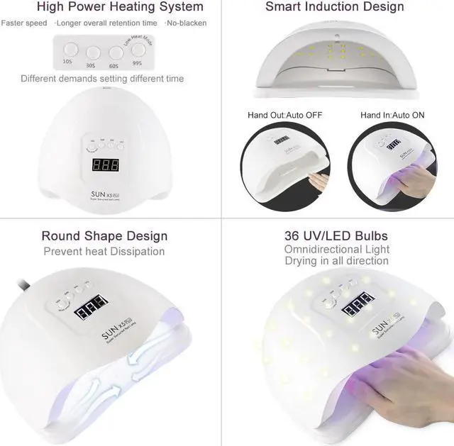 4:?UPGRADED SPECIAL APPERANCE DESIGN?-Big enough space of nail dryer can curing two hands at the same time. 360 degrees without light dead ends.Detachable base, designed for curing toenail and makes it clean up easily.Non-closed design will dissipate heat rapidly.