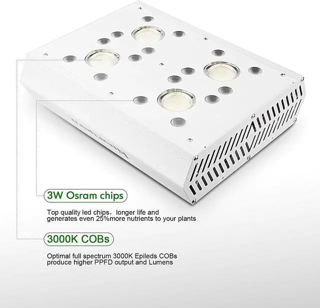 Top Rated Orsram LEDs and High Power Epileds COBs —— We only use high quality leds, which will never burn out like other cheap plant lights within months, even weeks! led grow light adopts 3W Orsram LEDs, which is one of the BEST led chips on the market, combined with our originally developed 3000K COBs, can provide TRUE full spectrum (380nm-730nm) with much higher PPFD(Par output) and lumens than other common grow light fixtures