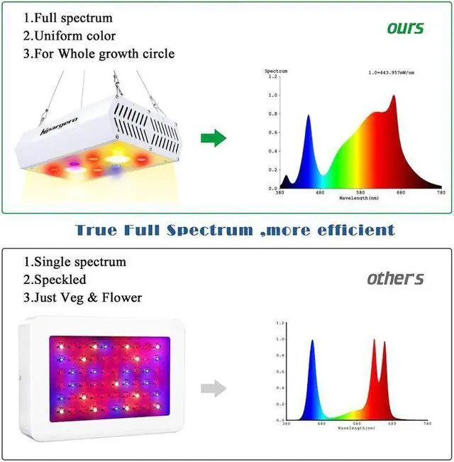 Optimal Full Spectrum from 380nm to 730nm —— Different with other common led grow lights with red and blue leds, HG series led grow light uses 3000K high power COBs, which are specially developed for plants, can provide really full spectrum lights from 380nm to 730nm, ideal for all kinds of indoor plants veg and flower at all growth stages. Added 3W Orsram LEDs provide more lights for plant's flowering and fruiting stages, help you plants get the best yields