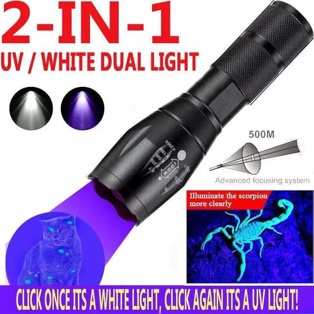Our Flashlight's LED Bulb is military grade ultra bright. The flashlight has 2 built in bulbs. With a click of the power button you can alternate between a very useful ultra high lux bright flashlight, and a powerful UV light when you need to detect something.