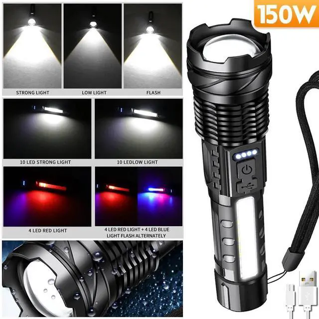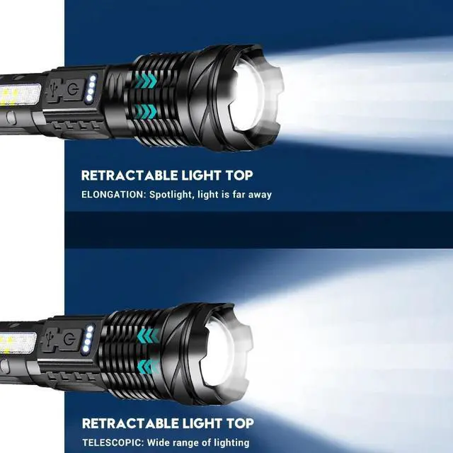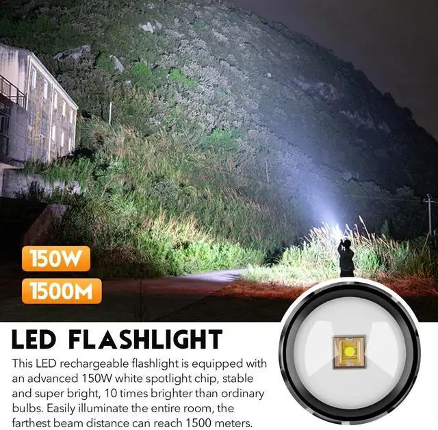 1. LED Flashlight: This LED rechargeable flashlight is equipped with an advanced 150W white spotlight chip, stable and super bright, 10 times brighter than ordinary bulbs. Easily illuminate the entire room, the farthest beam distance can reach 1500 meters.