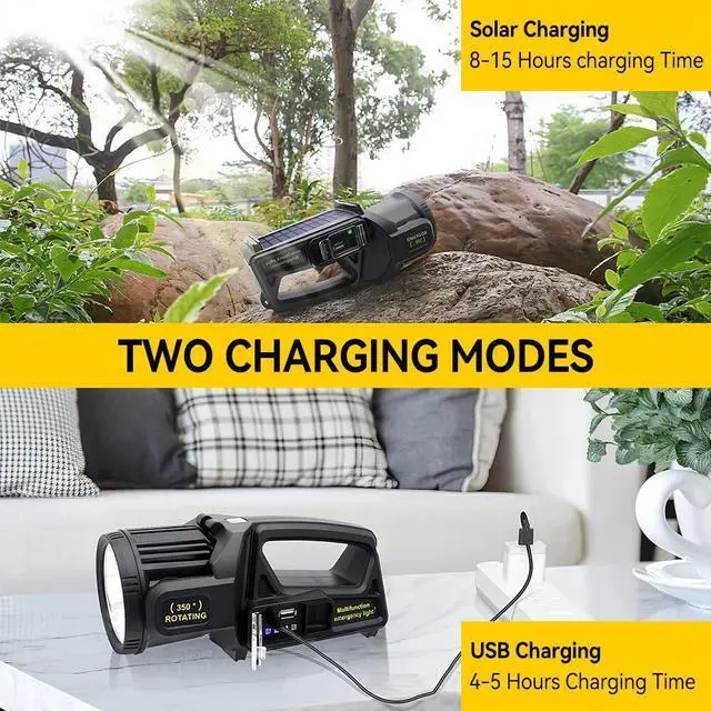4. Emergency Flashlight: Our rechargeable spotlight flashlight supports solar charging and USB charging, whether you're facing a power outage or away from the grid. It also doubles as an emergency power source, ensuring you stay connected and powered wherever your adventures take you.