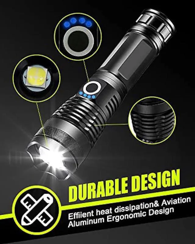 [ LONG BATTERY LIFE ] This super bright flashlight comes with a 5000mAh battery, enough to support 5-10 hours of lighting. Our rechargeable flashlight equips with 4 indicator lights to display the battery power remain. 4 indicator lights are on to indicate that 100% power remains, 3 to 75%, 2 to 50%, and 1 to 25%.