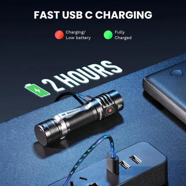 USB C Rechargeable: Inserted a USB-C charging port, large capacity battery included and fully charged in 1 hour through a 5A/2V charger. Approx working 6.3 hours at Medium mode (350lm), 23 hours at Low mode (100lm).