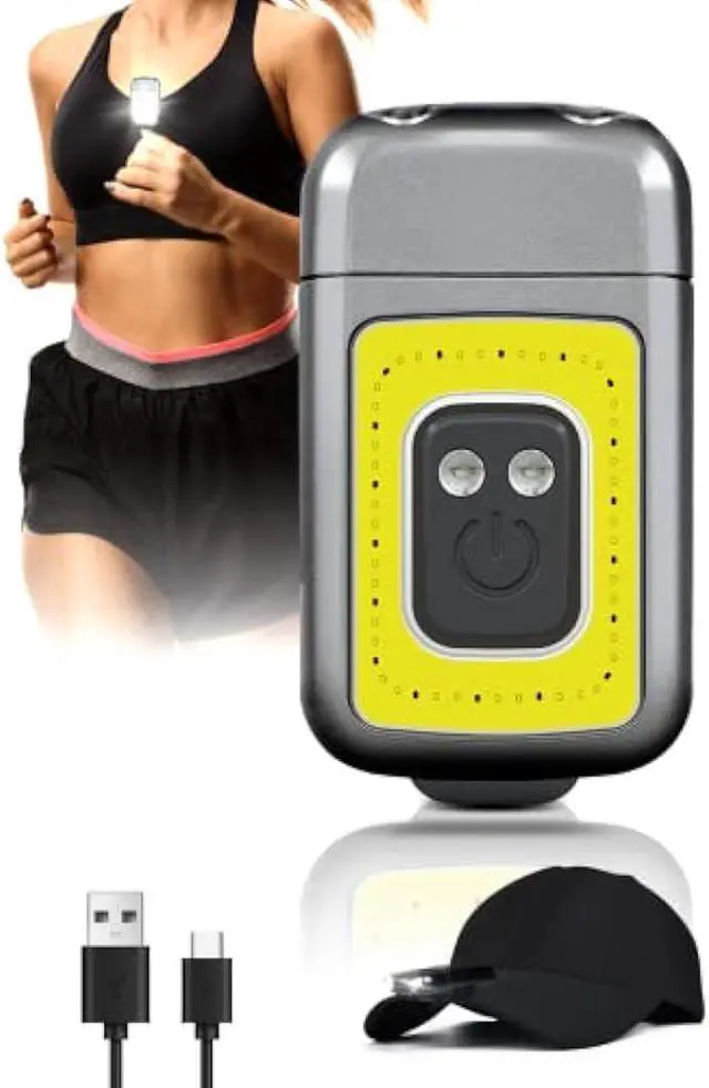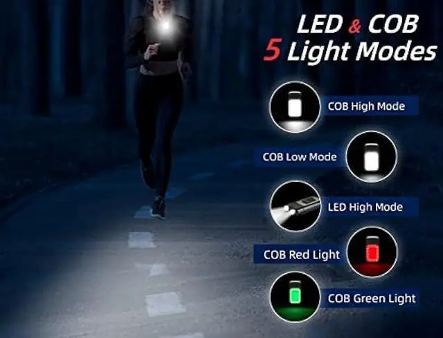 Lighting Modes: This clip on running light is made of ABS, with COB High brightness, COB Low brightness, COB Red light, COB Green light, LED High brightness 5 lighting modes. The light mode is more diversified. The light is brighter, the lighting area is larger, and the lighting distance is longer. White light is suitable for running, working and repairing, while red light and green light are suitable for warning.