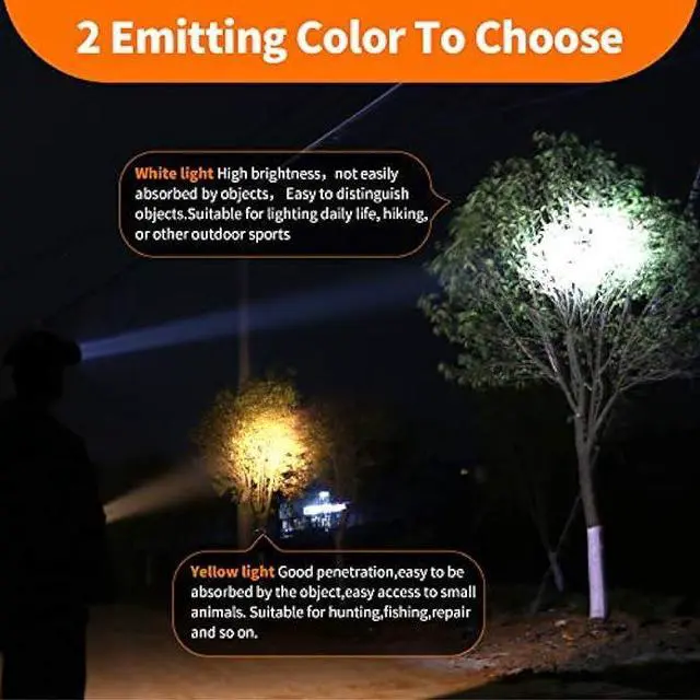 Two emitting color to choose, white light high brigtness, it suitable for lighting daily life, hiking, or other outdoor sports. Yellow light good penetration, it suitable for hunting, fishing, repair and so on.