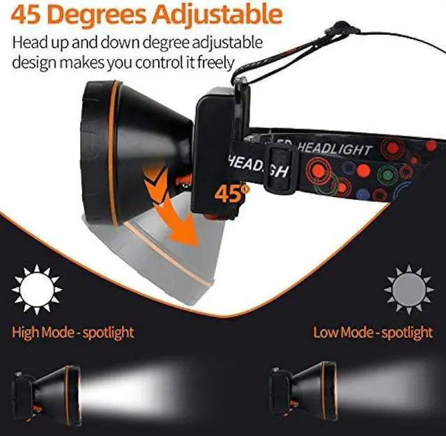 Two light mode superbright headlamp with low power consumption and long life LED, the LED life up to 100000H, which eliminates the trouble of replacing the bulb, the lighting distance up to 500-1000M.