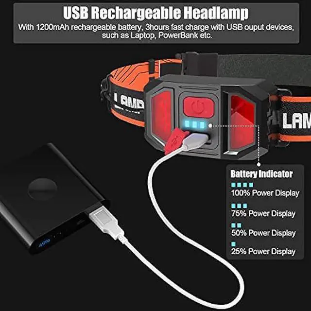 USB Rechargeable Headlamp & Battery Indicator---The rechargeable head lamp has a built-in 1200mAh rechargeable battery, 3hours fast usb charge. You can easily know how much battery is left through the battery indicator, allowing you to better use the headlight. Its rechargeable, can be charged with any USB output supply, such as power bank, car charger etc., no need to purchase lots of dry batteries again, very economic and Save money!. (battery and cable included)