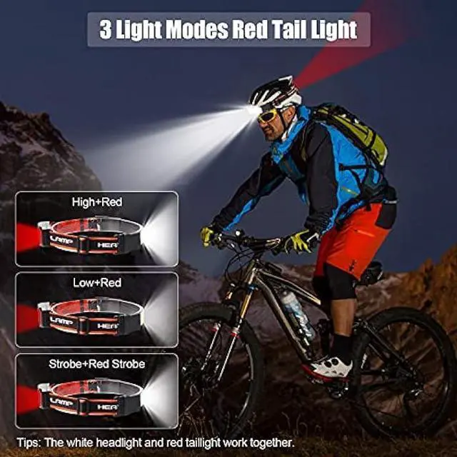3 Modes Easily Operation&Lightweight ---3 light modes, High/Low/Strobe, the white headlight and red taillight will work at the same time. Very easy to use. The rechargeable headlamp is only 3.7 ounce (weight with battery), it's a lightweight camping tool that can be used comfortably all the day. More comfortable than traditional headlamps, they are bulky and heavy on your forehead, Ours feels more like you are wearing a baseball cap than a headlamp.
