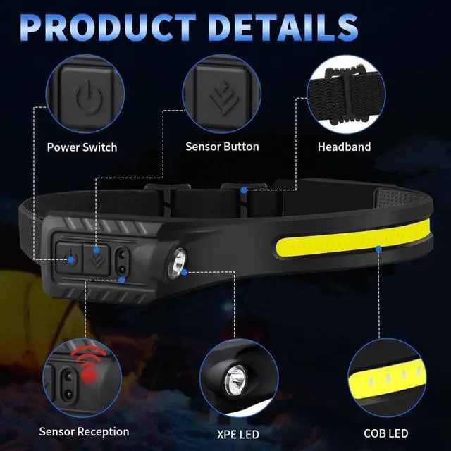 Sensitive Motion Sensor: Headlamps are equipped with the latest sensitive intelligent sensors that allow you to control head lamps without touching. When the head lamps led rechargeable are on, sensor mode is turned on by pressing the sensor button, and you can turn the headlamps on/off by simply waving your hand within a 2-inch sensing range.