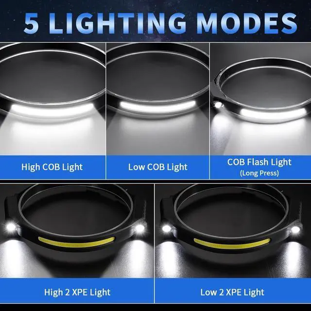 Lighting Modes: ZioeYiue headlamp Pro has 5 lighting modes, COB for 230°wide beam light, upgraded 2 spotlights for long distance illumination, and a long press of the ON/OFF button for 3 seconds to switch to COB flash. The LED headlamp has multiple modes to meet the needs of different scenarios in your daily life.