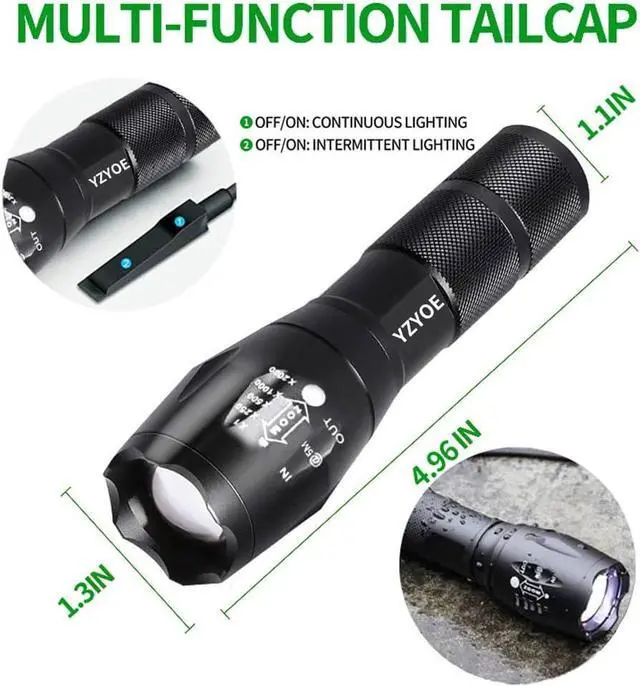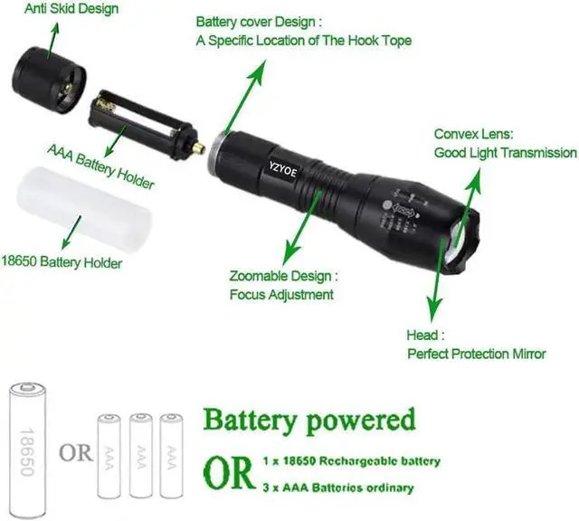 Zoom design: Our green LED flashlight can zoom by extending and retracting the front end. By extending and retracting the front of the product body, a circular floodlight is selected for large-area illumination. Alternatively, use a high beam spotlight for remote observation.