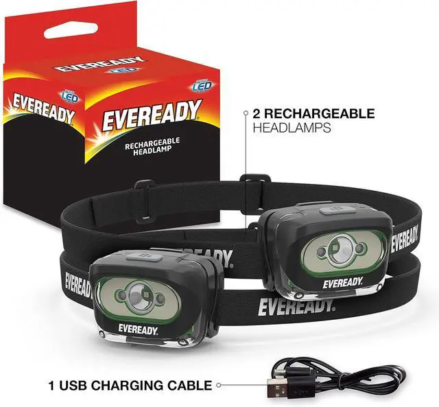 [Hands-free light]: Two (2) Eveready LED Light Rechargeable Headlights with included USB charging cables