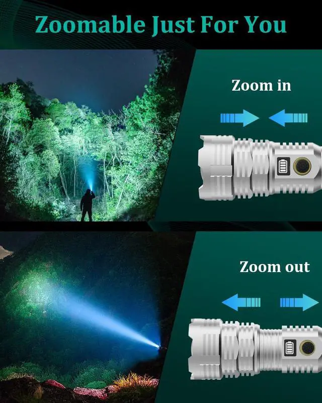 CONTROL LIGHT WITH YOUR DEMAND - The flashlights high lumens have 5 modes including low, medium, high, SOS, and strob. so the led flashlight can be used for lighting tasks such as courtyard, camping, hiking, hunting, while the flashlights high lumens rechargeable has the zoomable function. The zoom in or zoom out state can be adjusted as needed to provide you with a clearer view