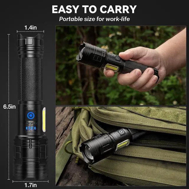4 power indicator (25% 50% 75% 100). Multi-Mode Flashlight - 7 lighting modes for different needs. This flash light high lumens has 3 main lighting modes (high medium strobe) and 4 side light modes (high medium strobe). Adjustable Beam - ALSTU flash light offers a variety of lighting options. By adjusting the head you can switch to focus the light to see distant objects or switch to a wide beam for a wider range of illumination. IPX7 Waterproof - Reinforced waterproof construction. Can be used in emergency during hurricane season or power outages.