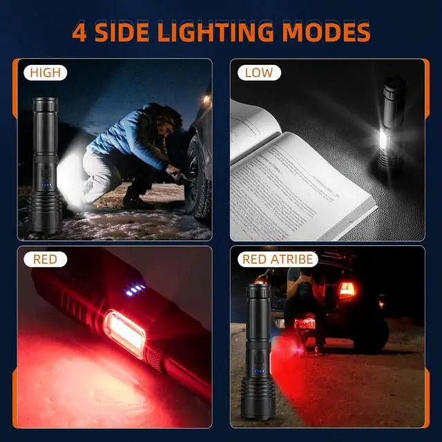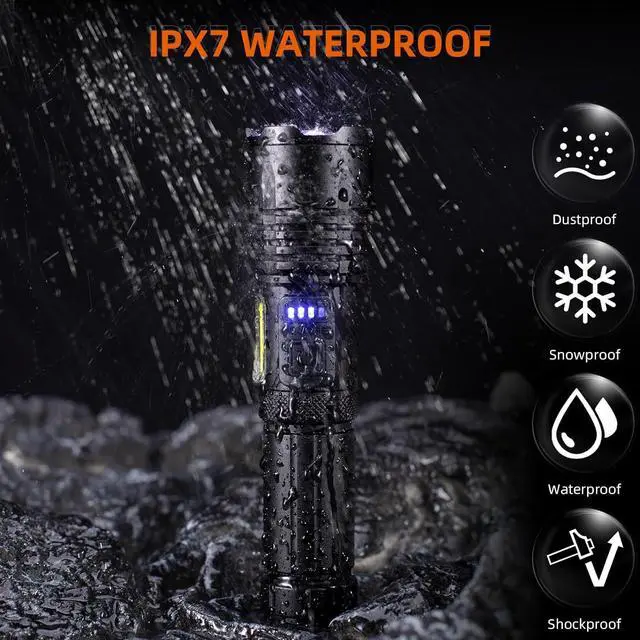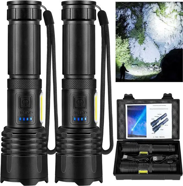 4 Indicators to know the power level(25% 50% 75% 100%)7 Modes Flashlight7 Lighting Modes for Different Needs. This flashlight high lumen has 3 main lighting modes (high medium strobe) and 4 side light modes (high medium strobe) Adjustable BeamThe flash light offers a variety of lighting options. By setting the adjustable beam you can switch the focused light to see distant objects or switch the wide beam for a wider range of illuminationIPX7 WaterproofThe flashlights for home in heavy rain or snow without worry making it perfect for emergencies during hurricane season or power outages. Do not immerse this worlds brightest flashlight directly into water or discard the dust cover of the charging port as these can directly damage the hiking flashlightPackage | GiftPackage includes 2 rechargeable flashlights (2 bttery included) 2 USB cables 2 lanyards 1 user manual and a gift box.