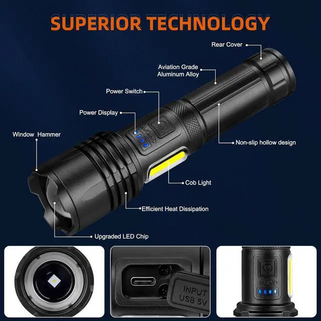 90 000 Lumen Powerful Flashlight30 times brighter than ordinary LED flashlight. The high power flashlight is embedded with super bright upgraded LED chips for 40% better performance and the flash light delivers an amazing lumens of brightness to clearly identify objects within 3280 feetRechargeable Flashlight8-24H Super Long Standby. This high lumen flashlight is equipped with an upgraded 5 000? Ah rechargeable bttery that lasts up to 24 hours in low-brightness mode and lasts up to 200 000 hoursQuick Charge | Power Indicator4 hours quick charge. Tactical flashlight high lumens built-in fast charging chip equipped with intelligent charging interface charging efficiency increased by more than 30% and over-voltage and over-current protection.
