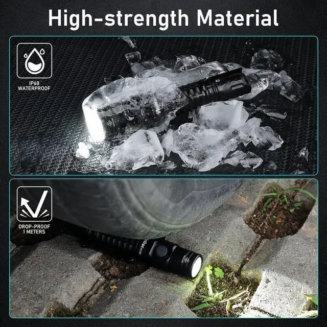 When the battery level is low (0%-30%) the red light will keep flashing lets you know the power status of the handheld flashlights in real time. IP68 WATERPROOF & Sturdy - Crafted from aero-grade aluminum alloy with an III hard-anodized finish rated IP68 waterproof impact resistant up to 1 meter. This waterproof flashlight can withstand harsh weather conditions.