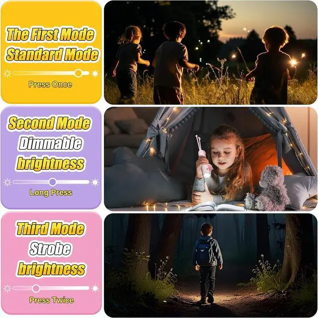 Multiple Lighting Modes: This flashlights for kids comes with three distinct modes: standard light flashing light and dimmable light (which can be adjusted to soft light mode to minimize the direct impact of intense light on the child's eyes). We're going to focus on the dimmable mode this is specifically designed to protect children's vision allowing your kids to choose a suitable brightness for a more comfortable viewing experience. The Unicorn toys for girls age 4-6 also includes a memory function so it remembers the last brightness setting used before it was turned off. Long Battery Life and