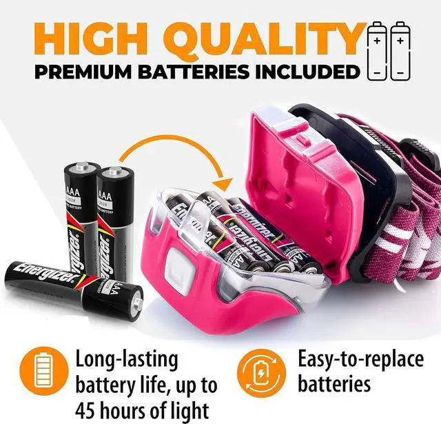SUPER LONG BATTERY LIFE by using leading technology MX20 provides more light with less power used, resulting in up to 45 hours of run-time. 3 AAA ENERGIZER batteries included. Each head torch has been tested for quality.