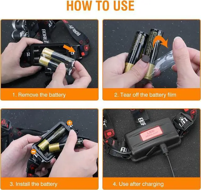Before first use, remove the protective film from the included batteries. This super bright headlamp combines ultra-bright illumination with extended runtime, delivering up to 10 hours of continuous use per charge.