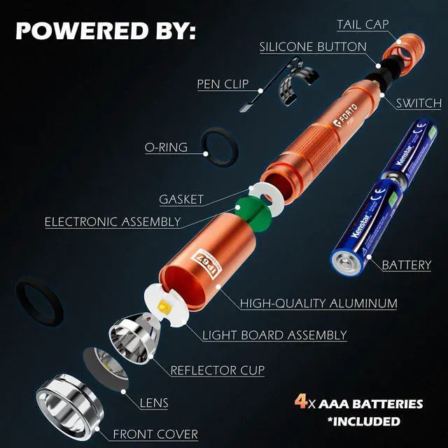 IP67 Waterproof & Dustproof (TIP: To change the batteries, unscrew the tail cap for quick replacement. )Designed for durability, FORTO pen lights are IP67-rated, making them fully waterproof and dustproof. They can withstand temporary submersion in water and are ideal for outdoor or wet conditions like rain, snow, or dusty environments.
