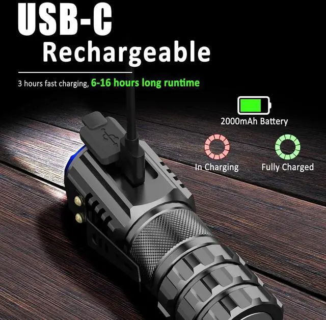USB-C Rechargeable: The pocket flashlight built-in 2000mAh Li-ion rechargeable battery, 3 hours for USB-C charging, 4-13 hours Long Runtime when fully charged. With the charging indicators, flashing red when power is low, and light red when charging, turn green when fully charged.