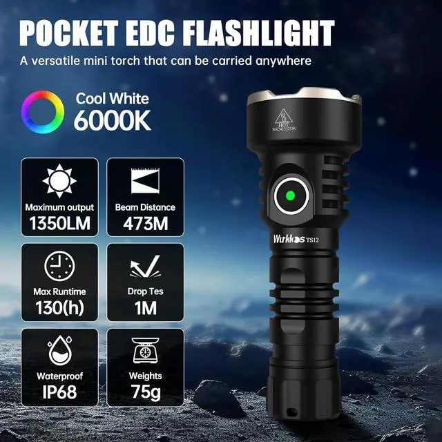 Small Frame, Huge EnergyWurkkos TS12 SFT25R is a updated EDC Flashlight and only palm-sized, super compact and portable for everyday carry. Our led flashlight emits up to 1350 high lumens of bright light, with a beam distance of 473 meters, maximum battery life is 130 hours.