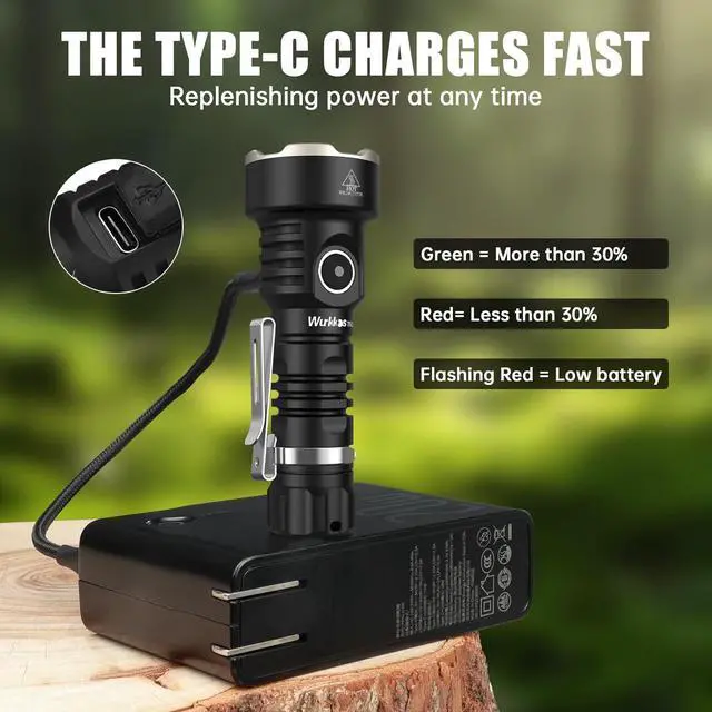 USB-C Rechargeable FlashlightOur powerful flashlight can be replenished with the included USB-C cable. Lights up green for more than 30% power, red for less than 30%, and flashes red for low battery. And it features anti-reverse installation function protected circuit to ensure safety.