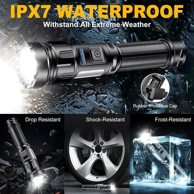 Waterproof & DurableFlashlights rechargeable high lumens are made of excellent aluminum alloy, impact-resistant up to 5 feet. With water-resistant, you can stop worrying about unexpected weather rain or snow. Please don' t put into water for a long time.