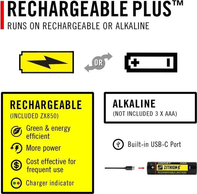 DUAL POWER: Power your flashlight how it suits you bestwith standard alkaline AAs (included) or a COAST ZITHION-X ZX850 rechargeable battery (purchased separately) for added convenience and savings over time.