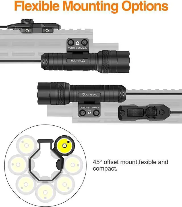 TOUGHSOUL 7019C flashlight Laser sight combo is a perfect light for daily use or hunting. The installation can be changed to 2 styles, support 45 degrees offset and 90 degrees straight installation. Flashlight is closer to the surface, more compact.