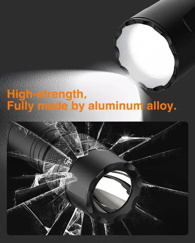 Durable & Shockproof & Waterproof Body. Sturdy aircraft aluminum body, type III hard anodizing surface with 1.5 m drop resistance, IPX67 waterproof, assembled with waterproof o-rings and anti-abrasive coating lens so the flashlight can be used in the raining day or swimming.