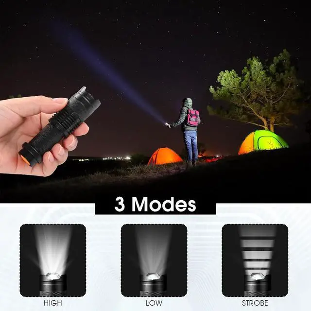 3 Modes Adjustable Brightness: small led flashlights with 3 adjustable modes, namely high, low and strobe modes, bright enough to light up an entire room, you can change the on or off buttons to adjust the mode according to your needs