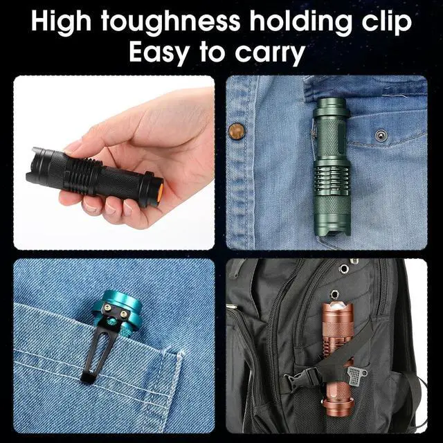 Portable and Compact: zoomable pocket led flashlight is about 3.58 x 0.98 inches, the mini size makes it easy to put into your pocket, backpack or purse, featuring with clips, mini flashlights can clip to your binder, shirt, backpack, belt or pants pocket