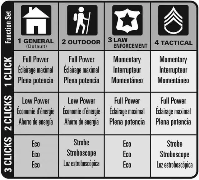 Four activity based function sets to choose from: General, Outdoor, Law Enforcement and Tactical
