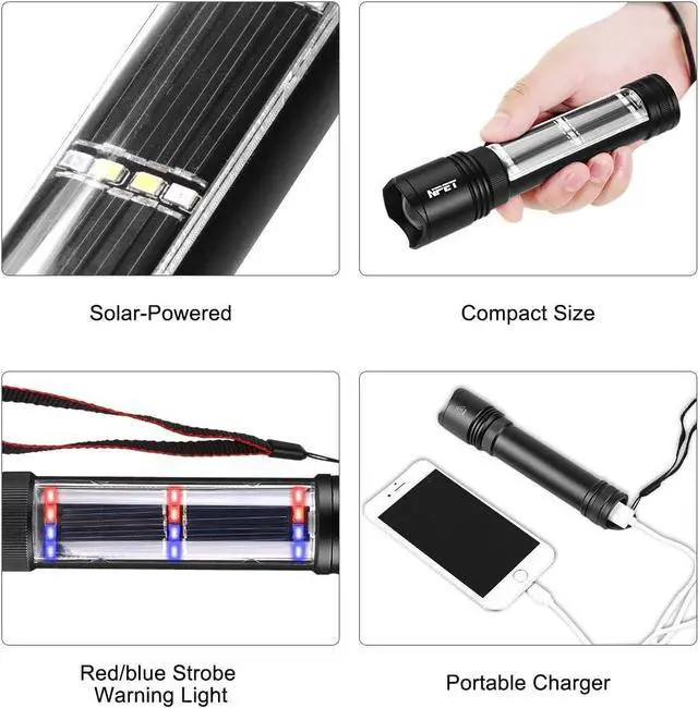 Rechargeable Power Bank: This solar flashlight could be charged with included USB Cable (4-5hrs) or Solar Power (30hrs), using the USB cable to connect your phone with the flashlight The battery needs to be greater than 20%and charging your phone for emergency.