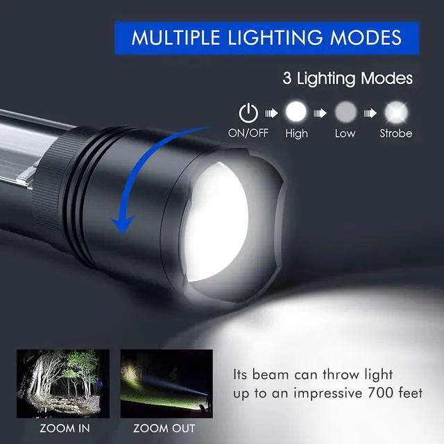 Adjustable Focus: Zoomable flashlight make it easy to adjust the irradiation range and light intensity. Irradiation range up to 200-300 meters.